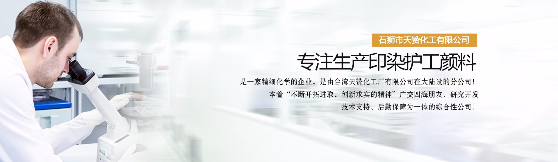 石獅市天贊化工有限公司是一家生產印染護工顏料的公司,是一家精細化學的企業,是由臺灣天贊化工廠有限公司。在大陸設的分公司!本著“不斷開拓進取,創新求實的精神”廣交四海朋友、研究開發、技術支持、后勤保障為一體的綜合性公司。二十年來,我們對紡織,前處理,后整理,技術的研究實踐中體會得經驗。